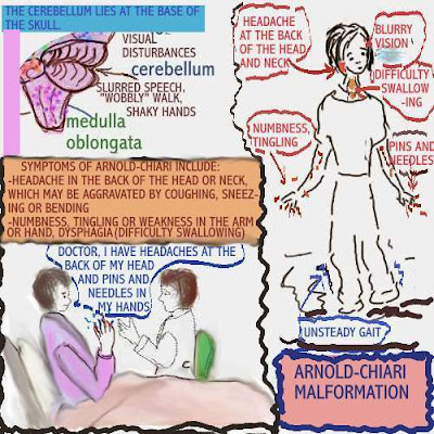 The symptoms of Chiari I malformation relate to the extent and the area affected by the herniation. Some patients with Chiari I malformation have no symptoms. Other patients are typically affected by pressure-like headaches or pain at the base of the skull or neck. Typical to a headache caused by Chiari I, these symptoms can worsen with physical strain, coughing, or change in position. Symptoms are caused by disruption of the CSF flow and compression of nervous tissues. Some patients experience sensory deficits such as vision problems (e.g., floaters, flashing lights), dizziness, and swallowing difficulties. Motor deficits can include weakness or tingling in the hands or feet, gait problems, difficulties with balance and coordination, or pseudotumor-like symptoms. Symptoms of pain or sensation problems may flare up. Other symptoms may include ringing or buzzing in the ear, sleep apnea, and snoring. Table 1. Common symptoms of chiari I and syringomyelia.