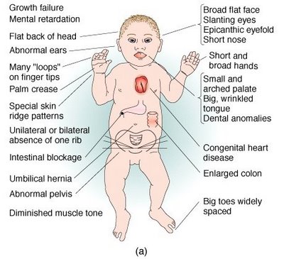 Down syndrome or mongolism is a condition in which a person is born with certain distinctive features : flat face, short neck, and a degree of mental delay (mental retardation). Although Down syndrome cannot be treated, most patients can lead a normal life. With the proper care and help they need, children with Down syndrome can have a spectacular growth and development and can become healthy and happy adults. Down syndrome was described in 1861 by Seguin in 1866 by Langdon-Down who specify the clinical features of this syndrome and in 1959, Lejeune specifies the chromosomal etiology.Frequency of Down syndrome is 1.5 per 1000 infants and sex distribution is 3 to 2 for male gender. It is considered that in the occurrence of Down syndrome is involved advanced maternal age, especially over the age of 35. At mothers aged 28 years it is recorded an increased frequency of births with Down syndrome, but this corresponds to a maximum number of births at this age. The risk increases with maternal age, as follows: